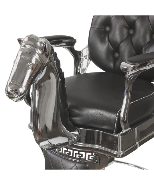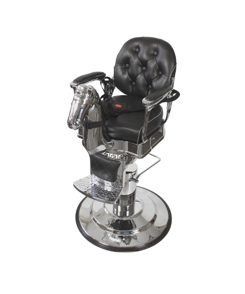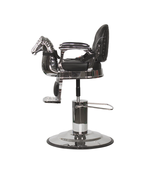Оригинальная модель, которая несомненно привлечет внимание маленьких клиентов. Эффектным элементом кресла является декоративная голова лошади. С внутренней стороны спинка кресла украшена декоративной прошивкой с круглыми пуговицами. Внешняя сторона сиденья украшена прошивкой в форме ромбов и металлическими пуговицами по краю. Подлокотники дополнены стильными накладками. Для удобства маленького клиента в кресле предусмотрена подножка. Для безопасности в комплектацию входят ремни, которые надежно фиксируют ребёнка. Для создания каркаса, основания и декоративной детали использована прочная сталь. Хромирование металлических элементов защищает от коррозии и придает креслу массивный внешний вид. На круглом основании предусмотрена специальная резиновая накладка, предотвращающая скольжение по полу. Обивка кресла в барбершоп – фирменная экокожа. Благодаря устойчивости к влаге и загрязнению, за материалом просто ухаживать. В качестве наполнителя использован упругий поролон, способный к самовосстановлению.