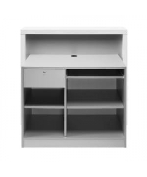 Стойка администратора, фасад - белый или чёрный, панель с подсветкой. Тумба - дерево (цвет серебро)