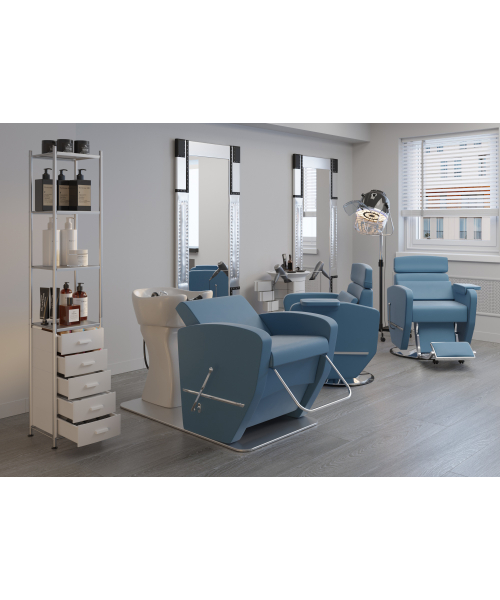 Стеллаж "Lino-5" - Компактный, вместительны и прочный, станет незаменимым помощником в работе. Металлический каркас выдержит большое количество предметов и оборудования различного веса. Открытые полки сделаны из цельных металлических листов и обрамлены бортами по периметру, что делает еще удобнее и безопаснее размещение на них инструментов, косметологических средств и даже аппаратов. Полки покрыты специальной краской, которая защищает от коррозии и влаги. Для ухода за поверхностью можно использовать моющие и дезинфицирующие средства.